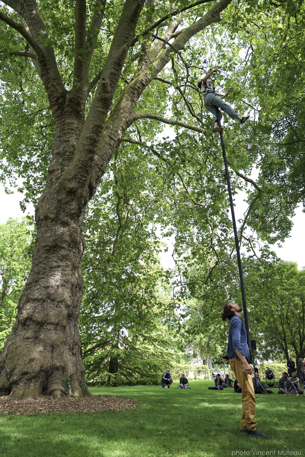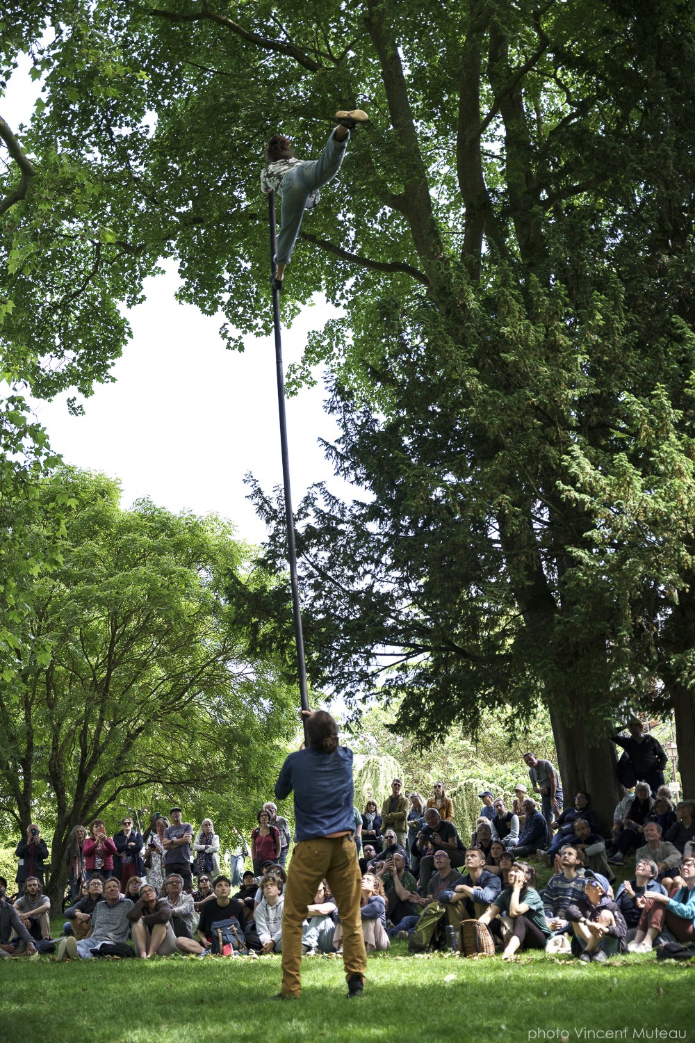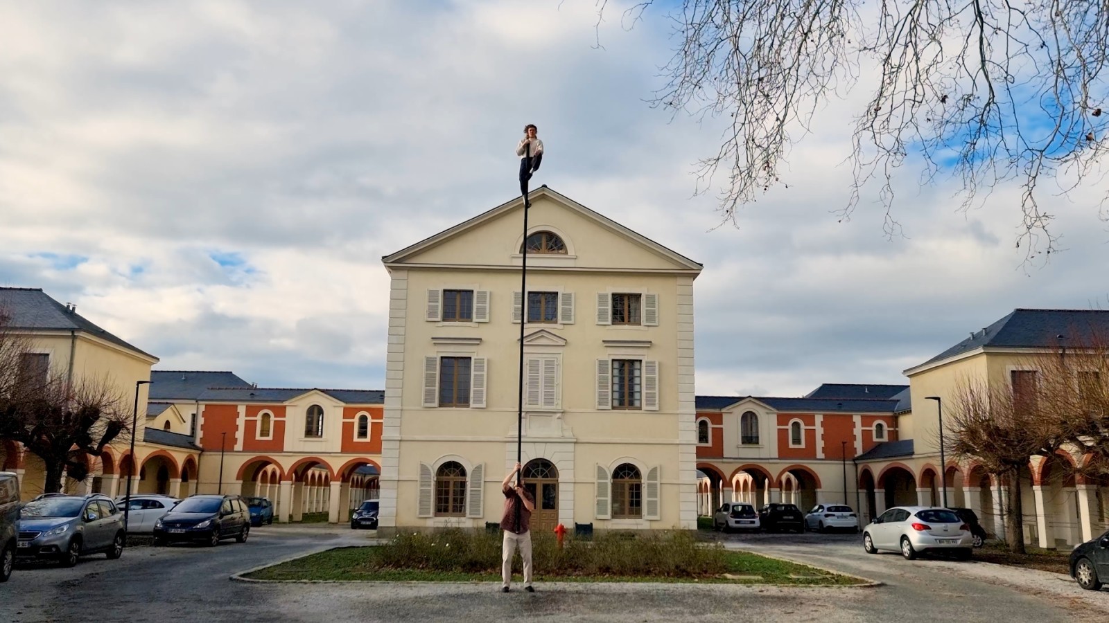 Les deux artistes de cirque utilisent une perche acrobatique.