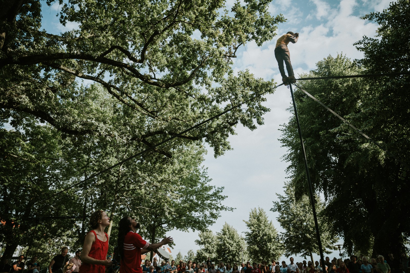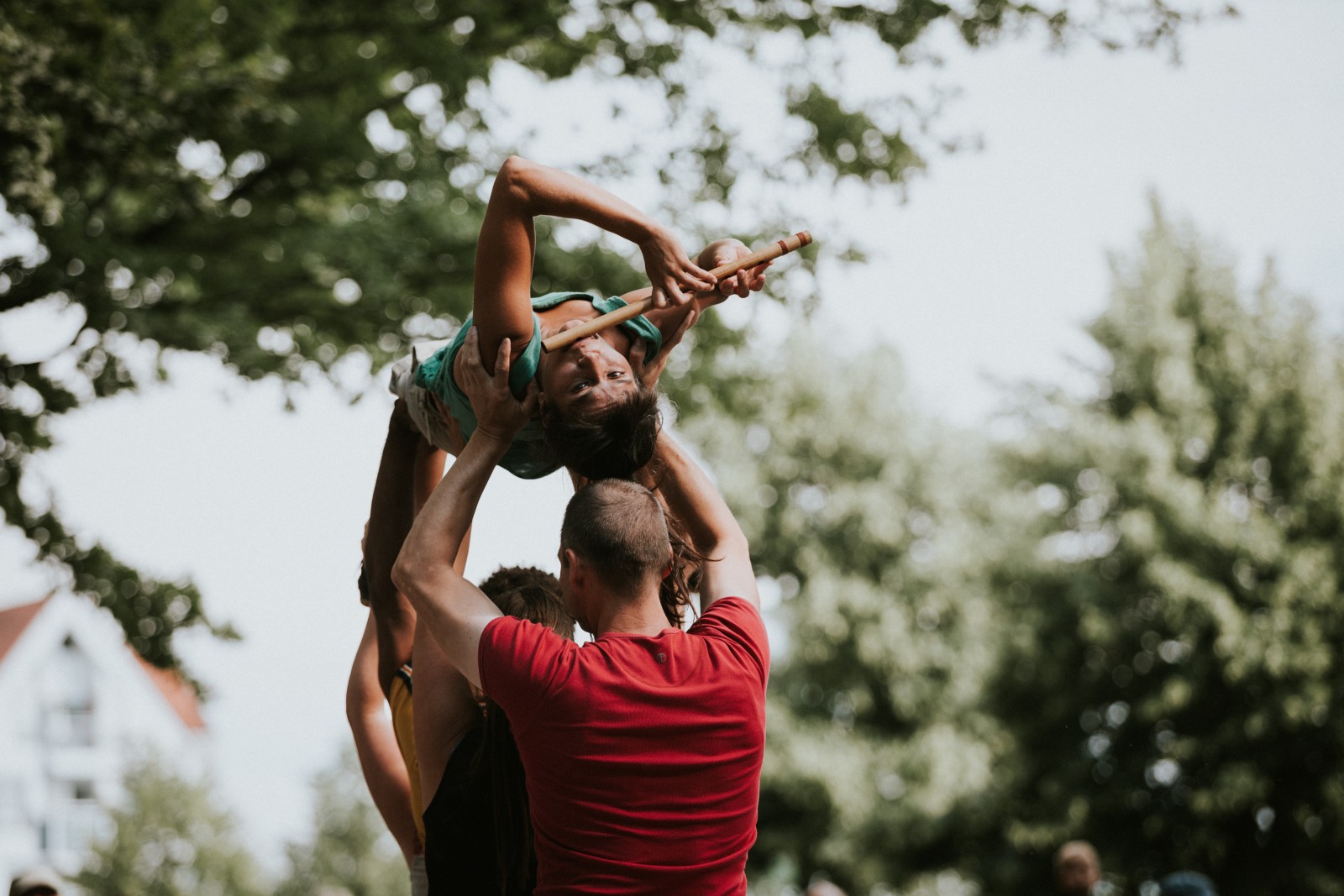 Danse contemporaine, pratique du mât chinois, acrobaties et musique live sont ici revisitées pour faire voyager et partager l’esprit de ces moments festifs.